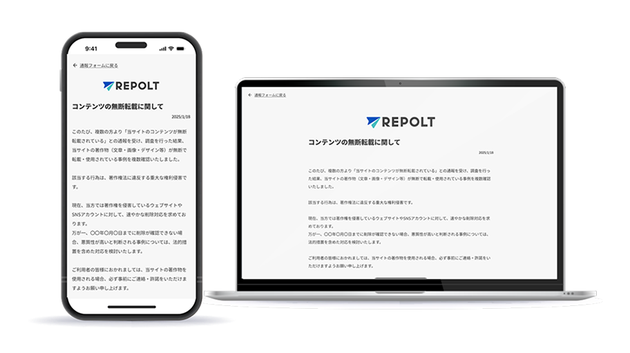 ウェブ上で通報フォームが作成でき、SNSアカウントや公式サイトで情報の収集をお願いすることで自分だけでは収集が困難な無断転載などの著作権侵害、なりすまし、デマ、誹謗中傷などのネガティブ情報をフォロワーなどと一緒に収集することができます。